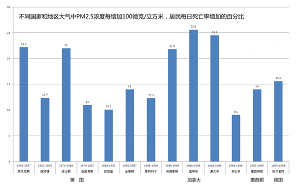 環(huán)境與健康雜志2005年7月第22卷第4期的一篇名為《大氣細(xì)顆粒物污染與居民每日死亡關(guān)系的Meta分析》的文章,綜合了1995至2003年27個(gè)國內(nèi)外公開獨(dú)立發(fā)表的關(guān)于大氣細(xì)顆粒物PM2.5污染與居民急性死亡關(guān)系的流行病學(xué)研究,分析得出PM2.5濃度每升高100微克/立方米,居民每日死亡率將增加12.07%。雖然不同地區(qū)居民對(duì)大氣PM2.5健康危害的敏感性差異較大,但大氣細(xì)顆粒PM2.5濃度升高導(dǎo)致居民死亡率上升的關(guān)系,已經(jīng)在全球不同地點(diǎn)、不同大氣污染背景、不同人群取得了相似的結(jié)果,并初步得到證實(shí)。這些研究直接促成了世界各國環(huán)境保護(hù)機(jī)構(gòu)(如美國環(huán)保局等)修改其大氣顆粒物,尤其是細(xì)顆粒物的衛(wèi)生標(biāo)準(zhǔn)。