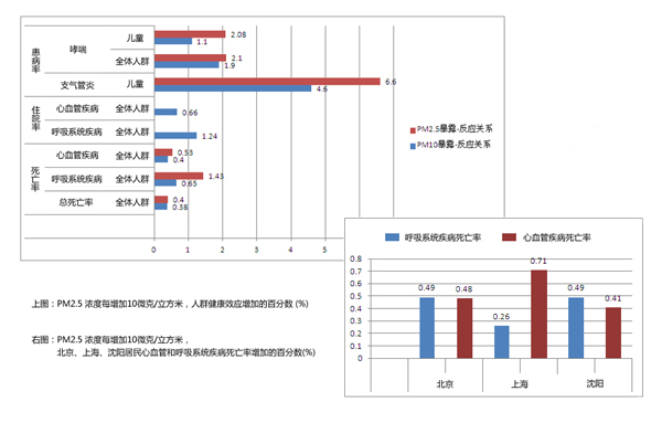 2009年中國環(huán)境科學(xué)雜志一篇名為《我國人群大氣顆粒物污染暴露-反應(yīng)關(guān)系的研究》的文章對(duì)中國城市PM2.5濃度和居民死亡率之間的關(guān)系也做過統(tǒng)計(jì)分析。分析顯示,PM10 濃度每增加10微克/立方米,人群急性死亡率、呼吸系統(tǒng)疾病和心血管疾病死亡率分別增加0.38%、0.65%和0.40%;PM2.5 濃度每增加10微克/立方米,人群急性死亡率、呼吸系統(tǒng)疾病和心血管疾病死亡率分別增加0.40%、1.43%和0.53%,這不但證明了空氣中可吸入顆粒物對(duì)人體存在危害,更證明了PM2.5 對(duì)健康的危害高于PM10。近日微博上流傳的發(fā)布于環(huán)境科學(xué)雜志上的一篇文章也顯示,PM2.5濃度每增加10微克/立方米, 北京、上海、沈陽三地的心血管和呼吸系統(tǒng)疾病的死亡率分別會(huì)增加0.49% 和0.48%、0.26%和0.71%、0.49%和0.41%。